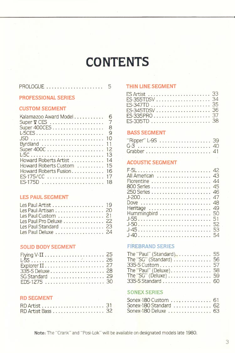 Gibson 1980 guitar, bass and banjo catalog. Page 3, contents. At 63 pages, this was one of Gibson's longest catalogues. It is separated into nine 'segments': seven in the Professional series, and one each in the Firebrand and Sonex series. Guitar shops had to be authorised to stock the Gibson range, however the Sonex series were branded differently, with "Gibson Guitar Co." on the headstock, not "Gibson". This allowed these guitars to be authorised separately, and presumably to a wider range of dealers.