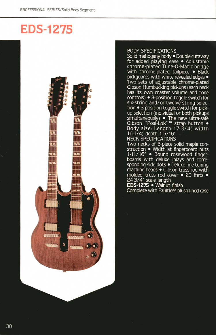 Gibson 1980 guitar and bass catalog. Page 30. Details of the doubleneck (one twelve string, one six string) EDS-1275 electric guitar, the only double neck instrument in the 1980 Gibson catalog.