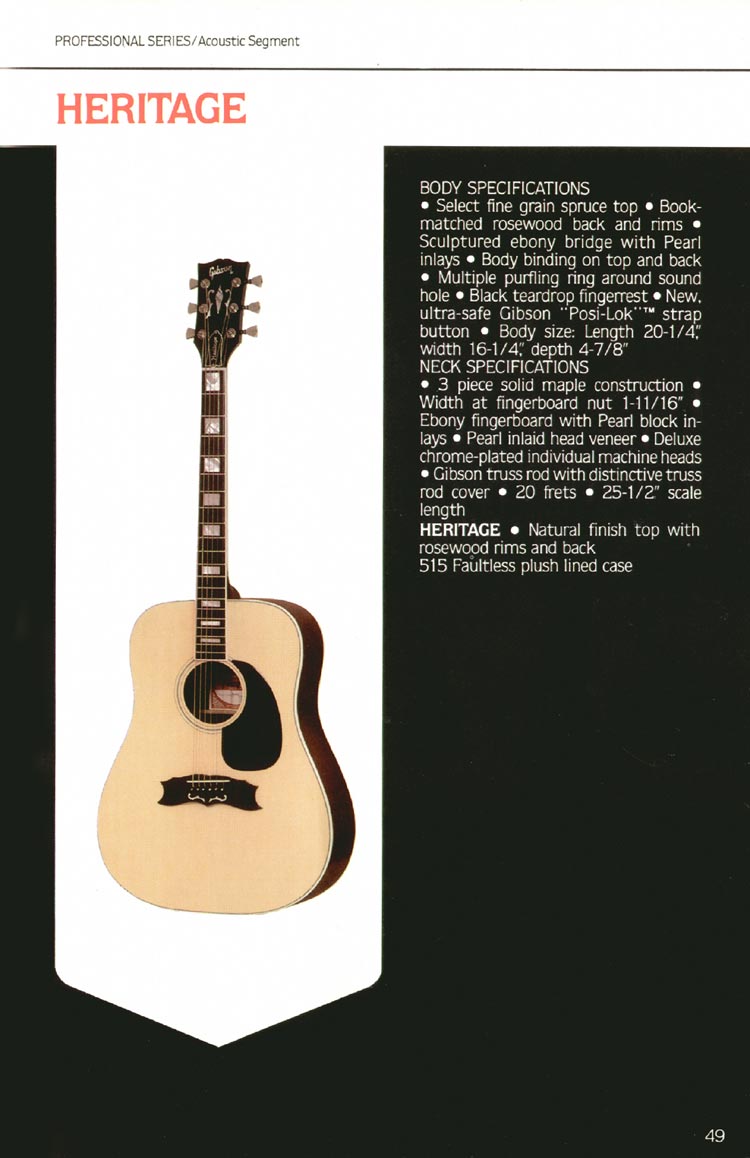 Gibson 1980 guitar and bass catalog. Page 49. Details of the Heritage flat-top acoustic guitar.