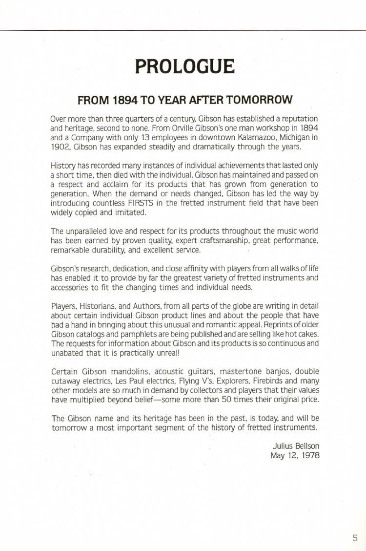 Gibson 1980 guitar and bass catalog. Page 5. An introduction to the catalog by Julius Bellson, Gibson's unofficial historian, written in May, 1978.