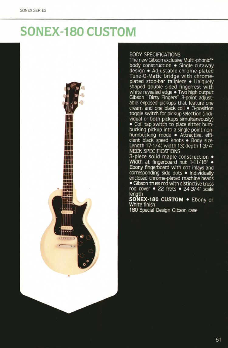 The first catalog inclusion of the Gibson Sonex-180 Custom. This was the top-of-the-line model in the Sonex series, with a maple neck, ebony fretboard and coil-tapable "Dirty Fingers" pickups. Other models in the series are the Standard-180 and Deluxe-180 that appear on the following two pages.