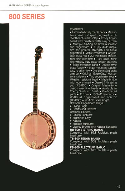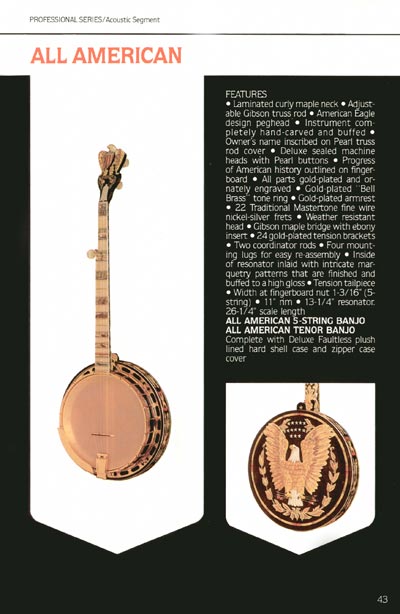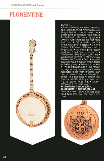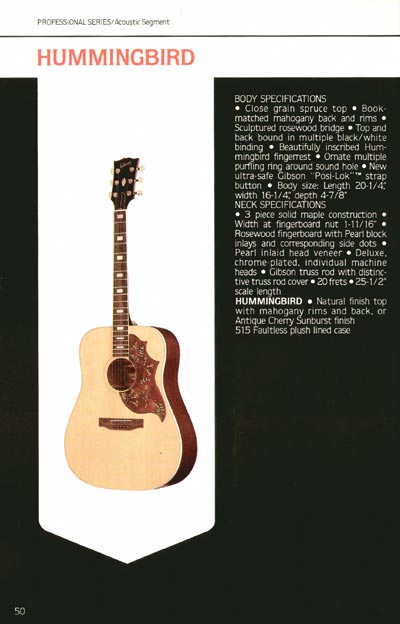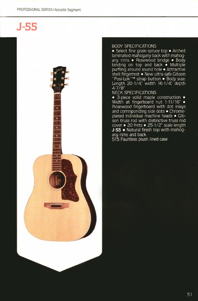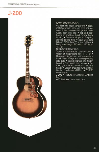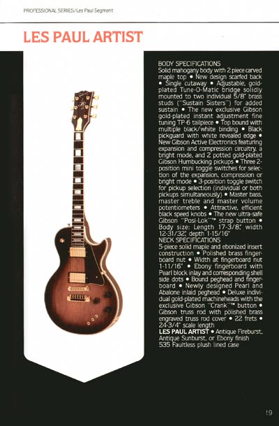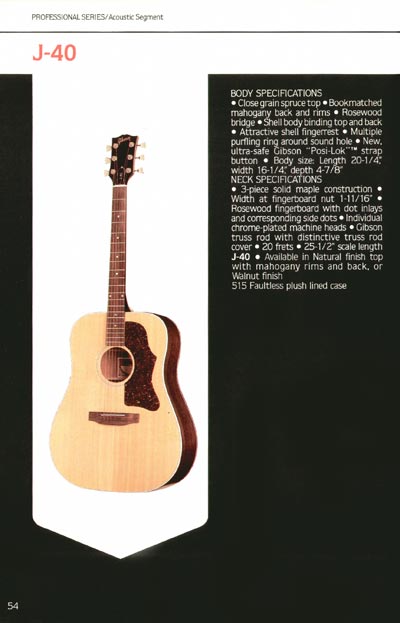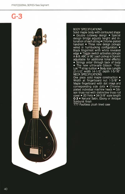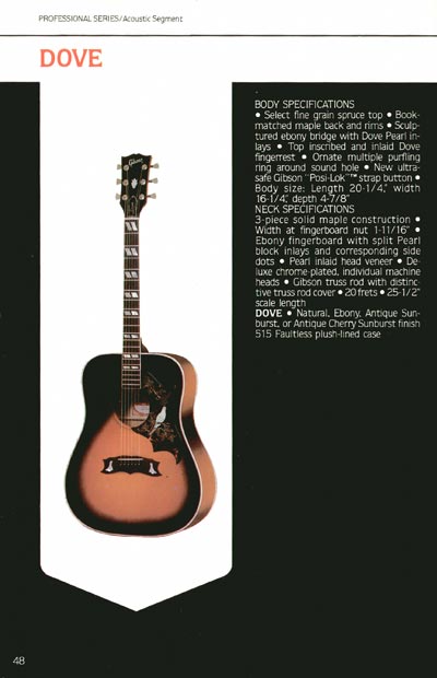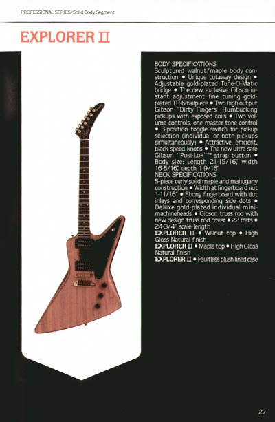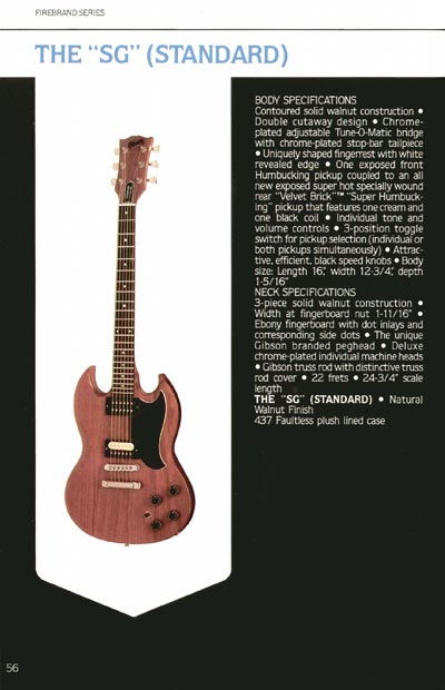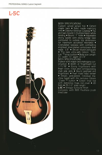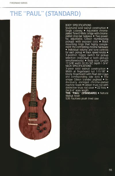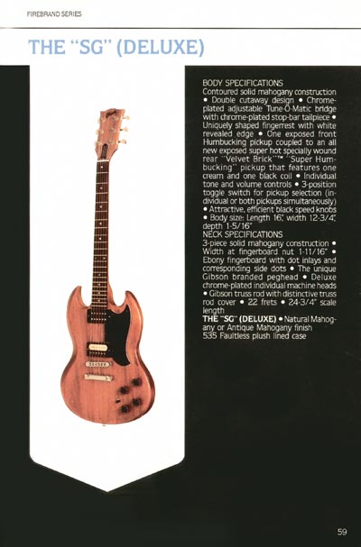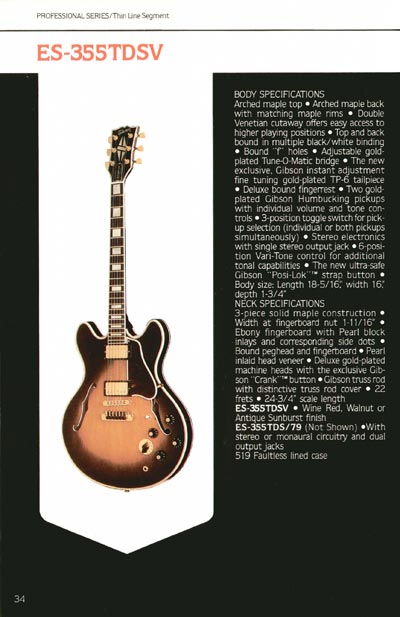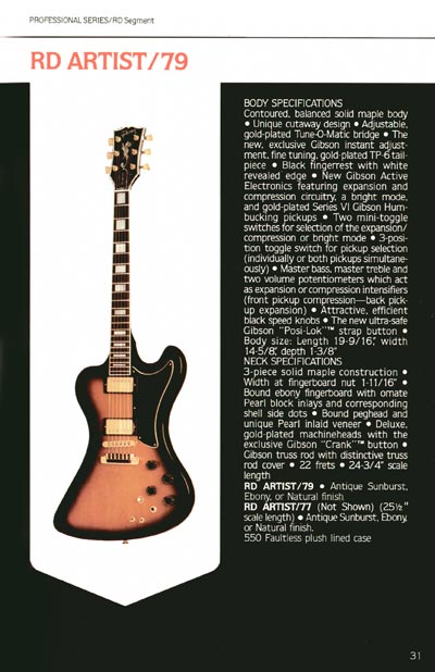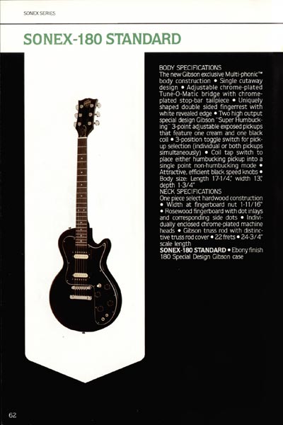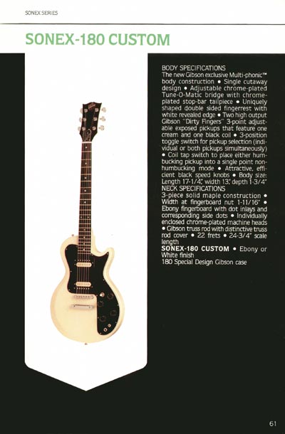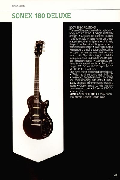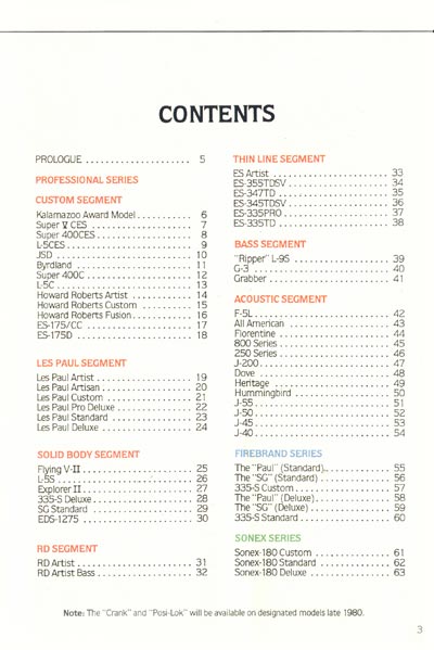 The 1980 Gibson catalog was quite different from those that preceded it. It was more of a book than a catalogue: smaller (6" by 9") with a thicker card cover, contents page, prologue, and printed in full colour. It was 68 pages long, including covers, with a separate model on each page. It was split into segments: Professional, Les Paul, Solidbody, RD, Thinline, Bass, Acoustic, Firebrand and Sonex.