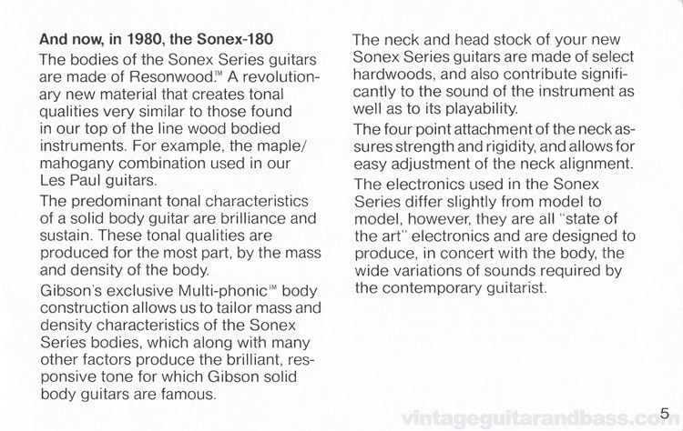 Continuing on from the Gibson innovations chronology on the previous page, 1980 saw the launch of the Sonex series, with the main innovation being the multi-phonic Resonwood composite body...