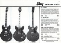 Catalogue page featuring a selection of Gibson's higher end thinline models: the ES-347, ES-355 TD SV and BB King Standard and Custom.