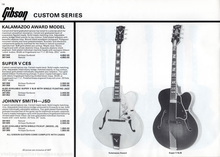 These were all high end jazz guitars. The Kalamazoo award, was incredibly exquisite; the 1981 UK list price of £4850 was over double the next most expensive model. The other two models described here were available in several variations. The Super V CES (which has the neck of a Super 400 attached to the body of an L-5CES) was available with humbuckers, or as the Super V BJB with a single floating jazz pickup. Likewise the Johnny Smith came as a single (JS) or dual (JSD) pickup guitar.