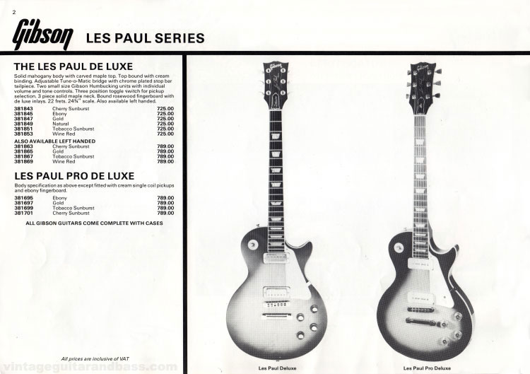 These instruments were priced in the UK as follows: Les Paul Deluxe £725; Les Paul Pro Deluxe £789.