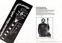 It was the largest folder in the series, with 24 inserts, (19 guitars and 5 basses): Guitars: 335-S Standard, Melody Maker Double, Marauder, L-6S Custom, S-1, RD Artist, Firebird, Firebird II, Flying V, Flying V-II, The V, Explorer, Explorer II, The Explorer, The "SG" Standard, Les Paul Artist, Les Paul Artisan, ES-335 Heritage, ES-175/CC Basses: Grabber, G-3, L-9S, RD Artist Bass, Flying V Bass
