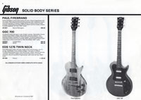 The GGC 700 was only produced for a brief time in late 1981/early 1982, and this appears to be the only time it was shown or described in a Gibson catalogue. Although only White and Twilight blue are listed here as finish options, Ebony (black) was also certainly available. In this UK catalogue, it is part of the 'solid body' series... however, in the US this guitar was part of their 'sonex series' - which often leads people to assume this guitar was made of the same resonwood as the Sonex-180 guitars. This is not the case; the GGC 700 had a mahogany body, as mentioned below. The confusion relates to the way Gibson authorised it's products to US dealers. Certain shops were allowed to sell 'sonex series' guitars (ie Sonex-180 and GGC 700) but not the rest of the Gibson line - read more about this here. This distinction does not seem to have applied in the UK, hence the GGC 700's placing away from the Sonex-180 guitars in this catalog (see page 10).