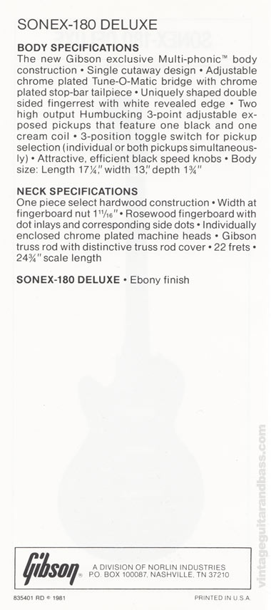 Insert 2 The Sonex-180 Custom, along with the Deluxe and Standard was one of the three models in the series launched in 1980. It was the top of the line initially, though now superceded by the Sonex Artist. This pre-owners insert shows the guitar on one side, with body and neck specifications on the other - the text comes from page 61 of the 1980 catalogue, and, like that of the Deluxe, has not been updated to include the new finish options listed in the April '81 price list.