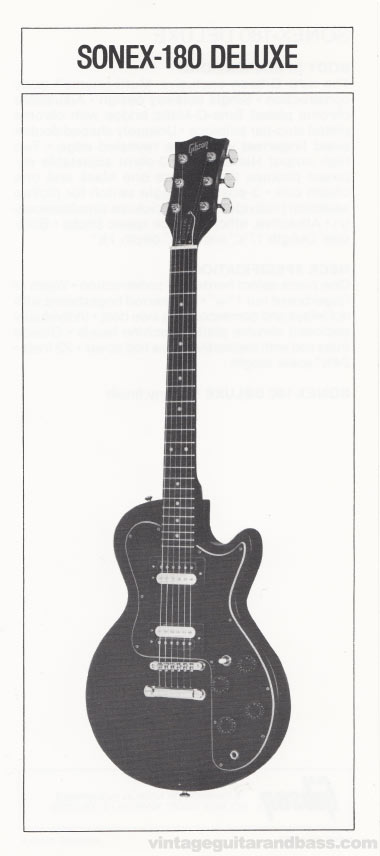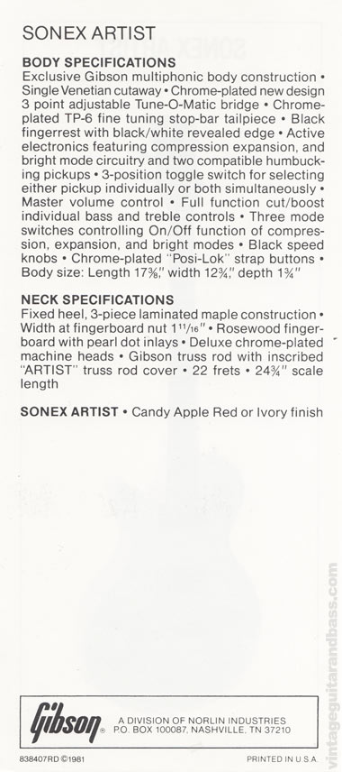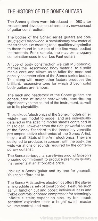 Gibson Sonex Pre-Owners Manual, produced in 1981. The Sonex series was launched in 1980, initially with three models: the Deluxe, Standard, and Custom, all of which were included in the 1980 Gibson catalogue; however by early 1981 the Standard was dropped, and a new model, the Artist, with built in active electronics was added.