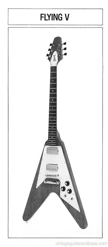 The Gibson Flying V was first reissued in 1966, and from then was available through a good deal of the late 1960s and '70s - but usually as some kind of special, and like the Gibson Firebird (also included in this folder), it generally wasn't included in catalogues and price lists of the time. According to a 1975 Gibson advert "demand to bring back the Flying V has gotten so out of hand, Gibson is now offering a special edition of this famous guitar". Sales were strong in 1975 and continued through the decade, but not to the level of the first year. And it is the remnants of this series that is advertised here: a mahogany body/neck Flying V, with a rosewood fretboard, and chrome plated hardware: patent number humbuckers, stop tailpiece and tune-o-matic bridge.