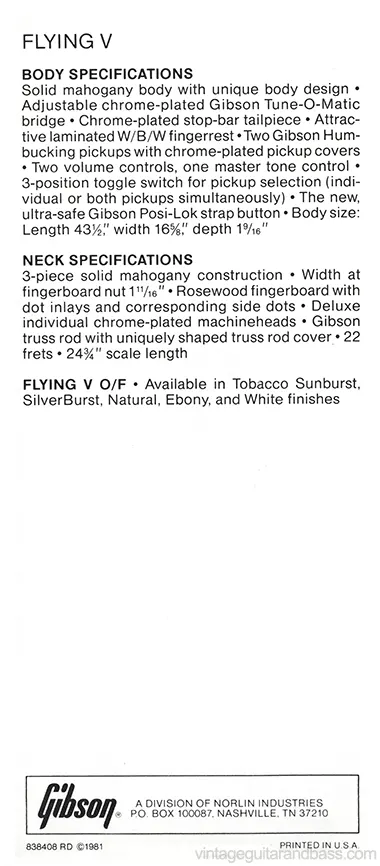 The Gibson Specials folder's rationale, was to present limited edition and close out models (see the inside cover); this guitar is a bit of both. It had already been re-imagined by the Flying V II and The V, and was about to be joined by the Korina-bodied Flying V Heritage. However this 70s close out was now available with a spectacular Silverburst finish - also now available on the L-6S Custom.