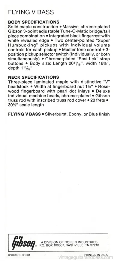 The Flying V Bass was another limited production / test marketing Gibson Special (see the inner cover for an explanation of what constituted a 'Special'), only briefly available and making its only US catalog appearance here. It was listed here as available in Silverburst, Ebony or Blue finishes, however later Ivory was also added. Like the majority of other test concept guitars in this folder, it had a list price (1st January 1982) of $999.