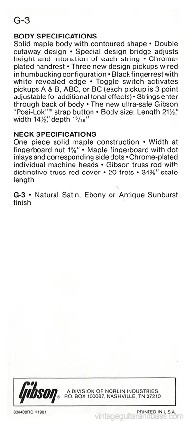 Like the Grabber bass and Ripper bass inserts in this folder, the Gibson G3 was a close out model (based on the defining characteristics of a Gibson Special, see the inside cover), last appearing in a US price list in July 1980 at $599 (Natural Satin) or $649 (Ebony / Antique Sunburst). However unlike many of the close out guitars in this folder, the G-3 actually held on a good deal longer than this - not in regular production (and not included in price lists), but with small batches shipping in late 1982 and again in mid 1985 (and perhaps at other times?).