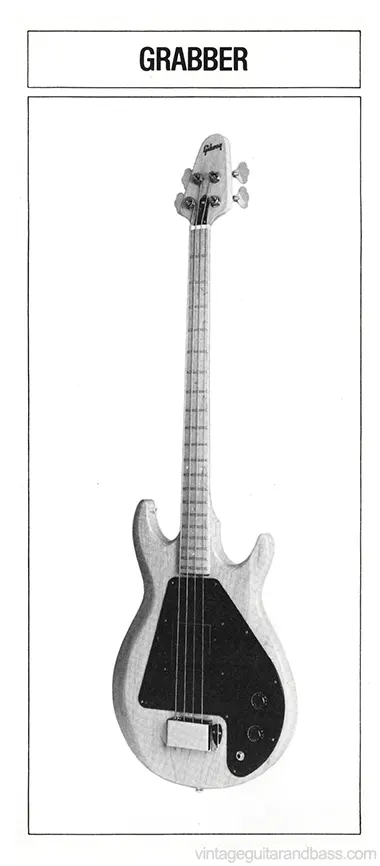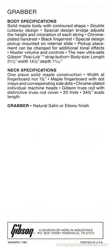 This insert details another close out bass, the Gibson Grabber. A close out (as detailed on the inside cover) was a model in the process of deletion, but being given a reduced price and a final push. The last US price list entry for the Grabber was actually July 1980, with the Natural Satin bass priced at $499, and the Ebony version at $549. Grabber production had stopped by 1981 when this folder was published, but the Grabber did ship again (in very small numbers) in 1982, and even as late as 1984, with very small numbers of basses being finished at the Kalamazoo plant. Although only Natural Satin and Ebony finishes are mentioned here, like the G-3, the 1982 and 1984 Gibson Grabbers were generally shipped in new colours, previously not associated with the model: typically Candy Apple Red or Metallic Blue.