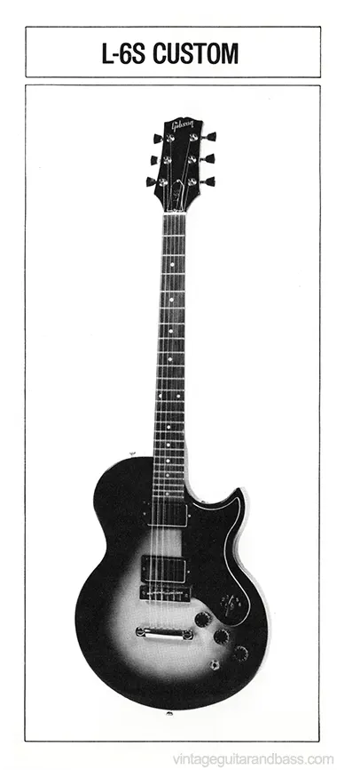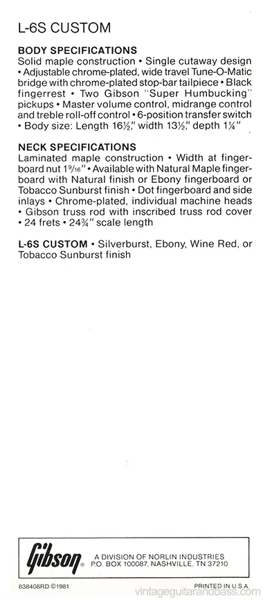 The L-6S had not been included in a US Gibson price list since January 7th 1980, and not in a US catalog since 1978. The text below is incorrectly copied from page 9 of the 1978 Gibson Quality / Prestige / Innovation catalog. Whilst the body specifications are identical, the neck specifications trip over themselves. They mention the maple fretboard on natural-finished guitars, and then get into a tangle in the wording. Of course, Natural finish is not even offered here. However two new finishes are offered, never having been previously available for the L-6S Custom: Wine Red and Silverburst. Like the existing Ebony and Tobacco Sunburst finishes, these were both supplied with an ebony fretboard.