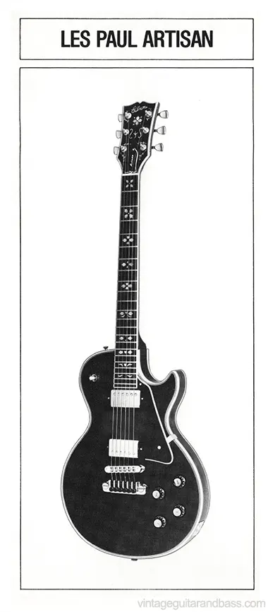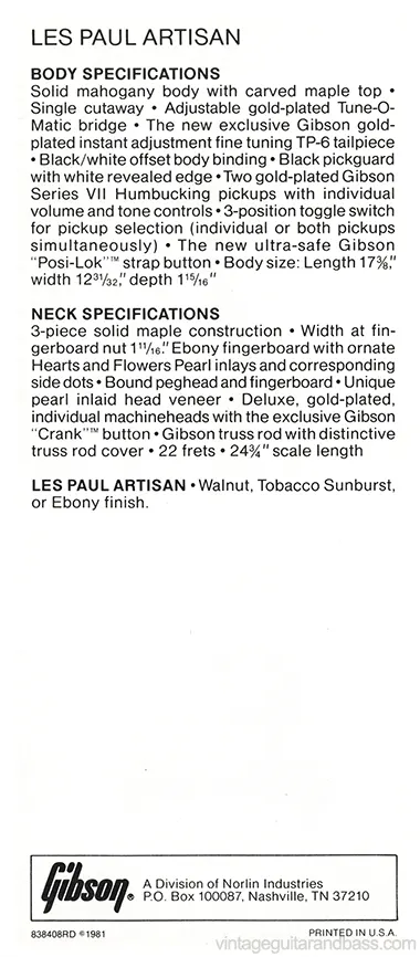 The Les Paul Artisan had shipped in relatively large numbers in 1977, but this had decreased year on year ever since. This pattern of sales was common to just about all of the close out guitars in this folder (see the inside cover for more about close outs). The text and image reproduced here are taken directly from page 20 of the 1980 Gibson catalogue. The final inclusion in a retail price list came in July 1981 with a tag of $1099.