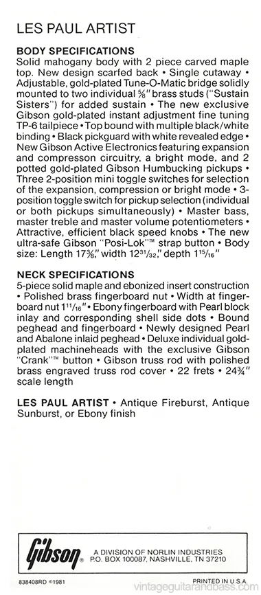 The Les Paul Artist was the Moog-circuitry equipped active version of the Les Paul. It had a very short production period, only appearing in two price lists, June 1979, and July 1980 - in both cases listed at $1299. The text and image reproduced here are taken directly from the 1980 Gibson Guitars catalog.