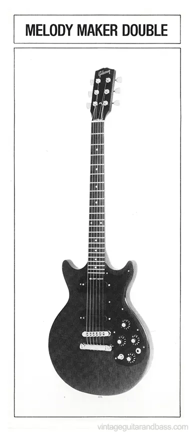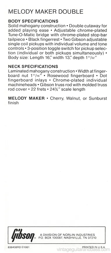 The insert for the Melody maker Double shows an image on one side, with specifications on the reverse. All text and image are copied (save the lack of colour) from page 10 of the 1978 Gibson Quality / Prestige / Innovation catalog.