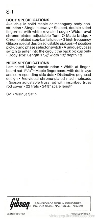The Gibson S-1 insert detailed the guitar essentially identical to it's last listing in the 1978 Gibson Quality / Prestige / Innovation catalog, using the exact same text (except the choice of finish options) and seemingly the same image. The only finish option listed is Satin Walnut, as had been the case since mid-1979. The Gibson Marauder, a closely related model, was actually offered in three new finishes in this folder, and it would not be beyond the realms of possibility to find examples of the S-1 in alternate finishes, though as stated none are suggested here.