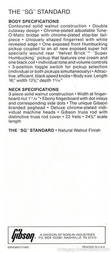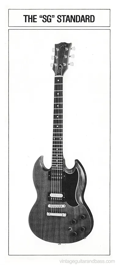 The insert for Gibson's The "SG" Standard shows an image and specifications identical (save the lack of colour) to the description/image on page 56 of the 1980 Gibson catalog. It was pretty unusual in that it had an all-walnut construction (body and neck) with an ebony fretboard. No maple, mahogany or rosewood in sight!