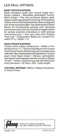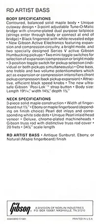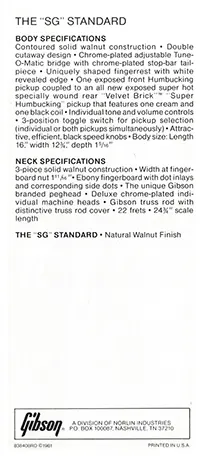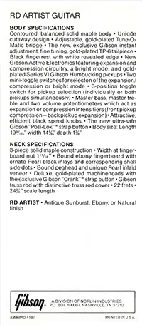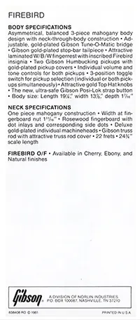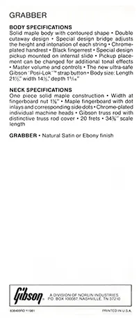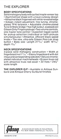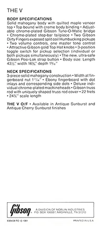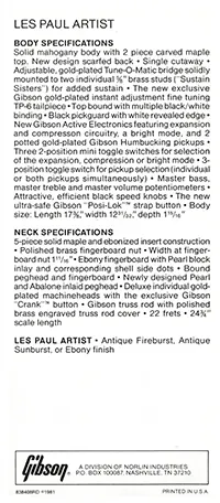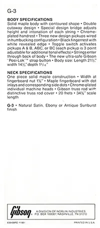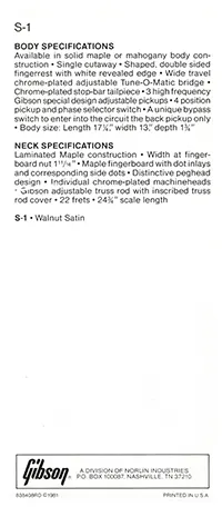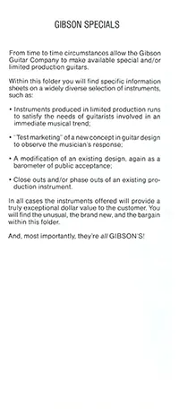 Gibson 'Specials' Pre-Owners Manual, first announced in June 1981. The catalog format of 1981, was very different to the plush, full-colour 'book' of the 1980 Gibson catalog. It consisted of a series of mini-folders each containing separate inserts describing various models in that segment. Each insert was printed in black and white, with an image of the guitar on one side, and body and neck specifications on the reverse.
