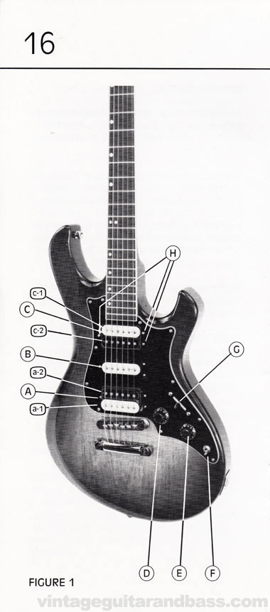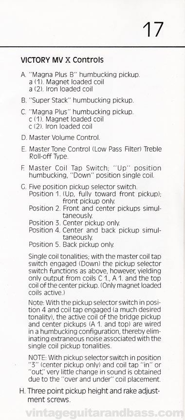 Pages 16-17 Labelled diagram of the Victory MVX with a detailed explanation of the pickups, (right down to which coil is which!) and the guitars controls. No other Gibson manual goes into such detail, but then, perhaps the reason why this guitar was so special could easily be missed. The three pickups are a Magna Plus at the neck, a similar (but overwound) Magna Plus B at the bridge, and a Super Stack in the centre.