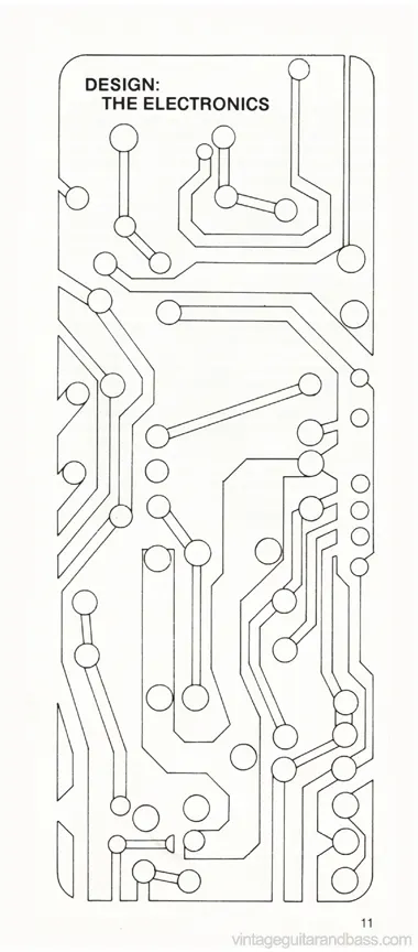Pages 10-11 Design: the neck / headstock / fingerboard and electronics. Details of the 'Thunderbird' headstock design, and the rosewood fingerboard.