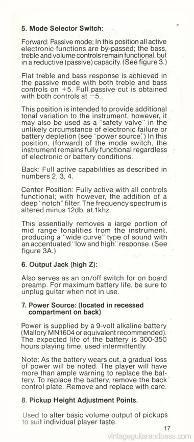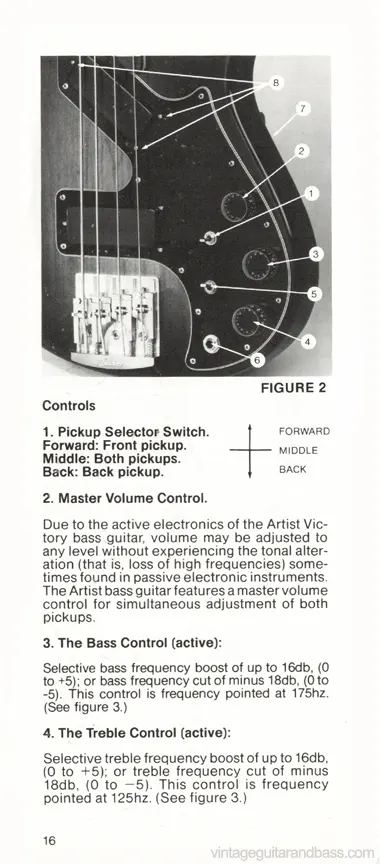 Pages 16-17 Explanation of the Victory Artist bass controls. The Active circuitry is controlled by the mini toggle switches mounted into the pickguard.