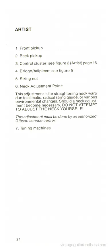 Pages 24-25 Labelled image of the Victory Artist bass, showing bridge, pickups, controls, nut and truss rod adjustment cavity