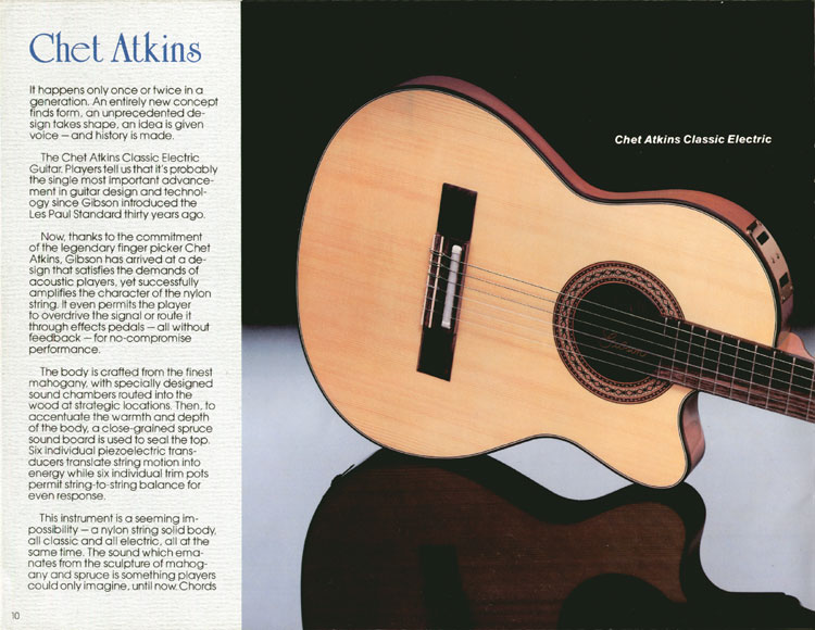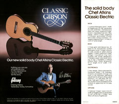 First page of a two-page spread on the Chet Atkins Classic Electric, giving a description of Gibson's 'new concept' which they described as 'the single most important advancement in guitar design and technology since Gibson introduced the Les Paul Standard'. Although it looks like an (electric) acoustic guitar, it is in fact a chambered solid-body, with mahogany body and spruce top. It was included in the solid body section of price-lists of the time, initially (June 1982) with a price tag of $999 for the regular 1 13/16" width neck, or $1099 for the 2" width neck.