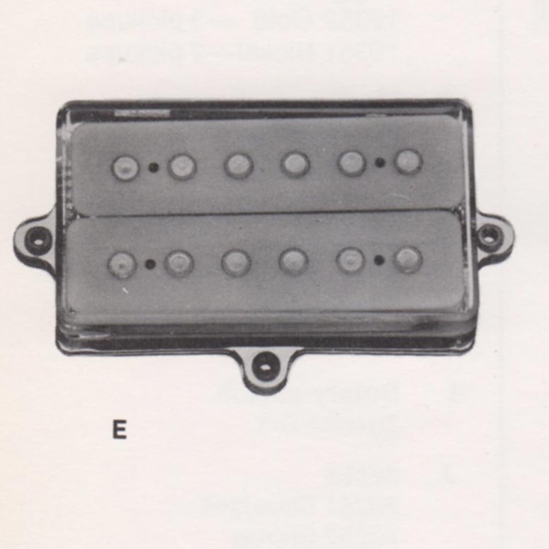 It was of super humbucking, traditional coil configuration, with three indox ceramic magnets for "bright/loud" tonality. From the Gibson 1978 promo magazine: "The front pickup is similar to the Super Humbucker with small additional magnets reinforcing and directing the field". Dimensions 1.64" x 2.87" x 0.75" tall.