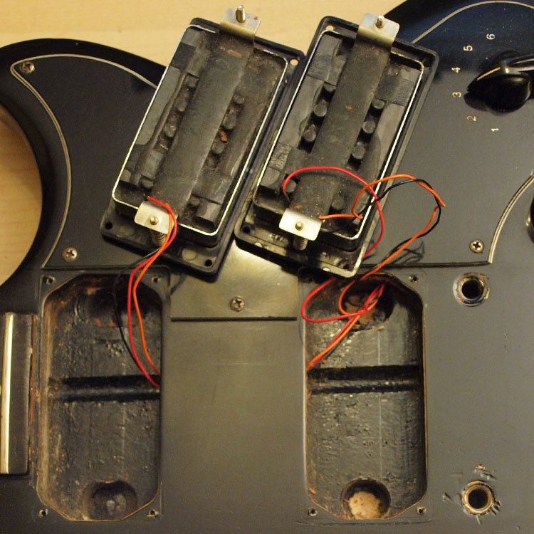 The pickup was used in both neck and bridge positions. Part numbers 13682 (neck) and 13683 (bridge). Dimensions: 70mm x 38mm x 19mm (excluding mounting tabs); Surround, 90mm x 45mm; Mounting screw holes are 78mm apart. Each pickup has three wires, orange red and black - see images.