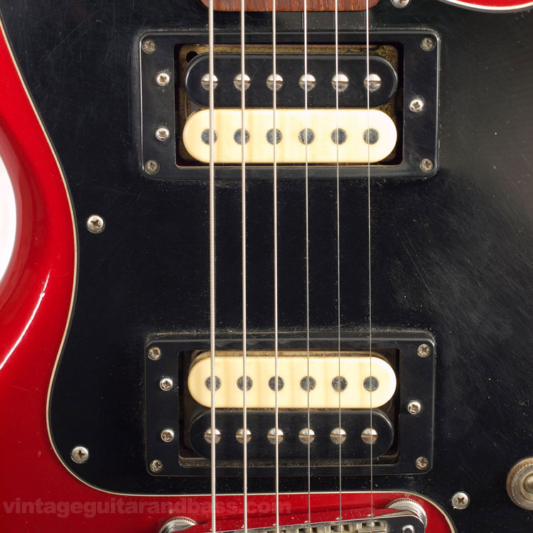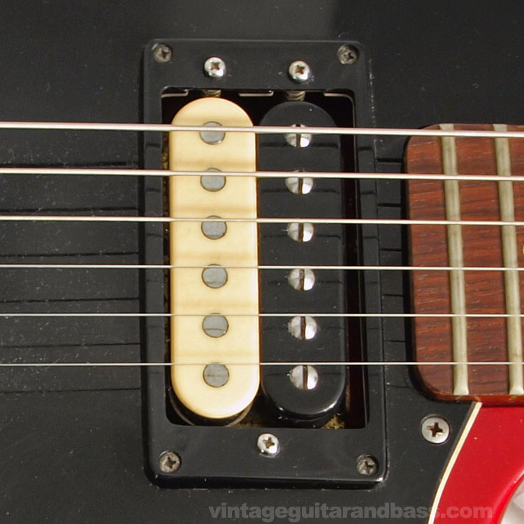 Note the adjustable polepieces are in the black portion of the pickup - positioned closest to the neck in this case, but reversed (closest to the bridge) on the back pickup. The pickup is height and angle adjustable via three spring-mounted screws through the black plastic surround.