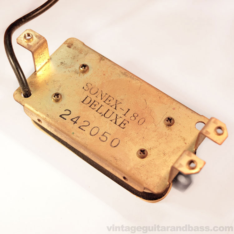The two humbucking pickups fitted to the Sonex-180 deluxe guitars (parts 13248, neck; 13249, bridge) were different to those fitted to the Sonex Standard and Custom models, and were imported from Japan, rather than wound in the USA as most Gibson pickups were. These are often incorrectly described as the well-regarded 'Velvet Brick' pickups, and although similar in appearance (both had the black/cream 'zebra' coils) they are not the same pickup. Note the colours (and hence polepieces) are reversed on the two pickups; they are the mirror image of each other.