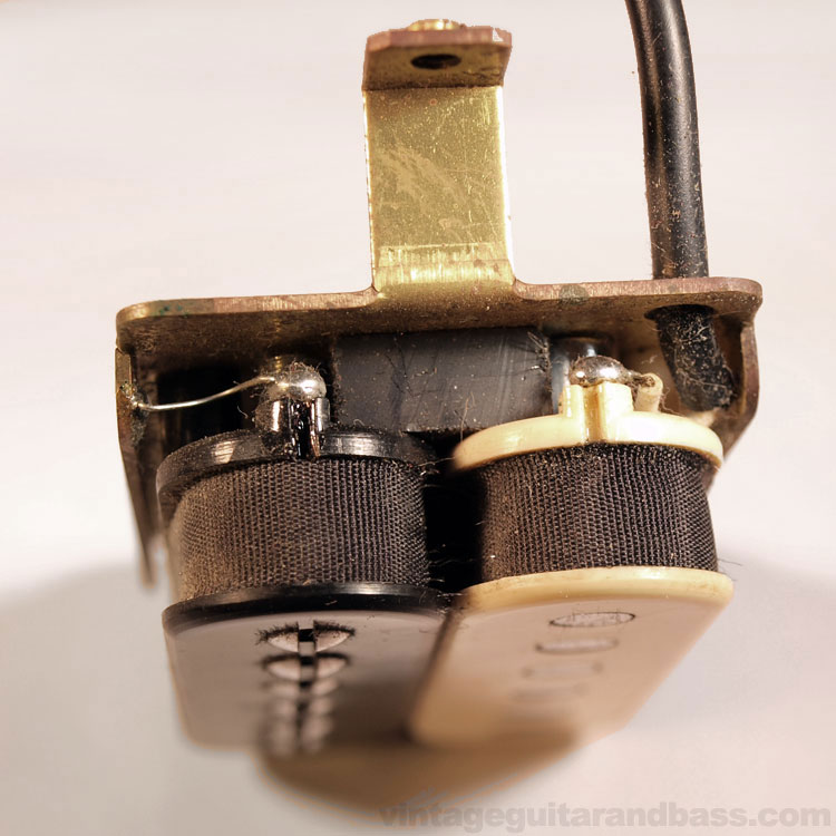 The pickup is fairly straightforward: two coils, each wrapped around a cream or black former, sit upon a bar magnet, which, in turn, sits upon the metal bassplate with mounting brackets. The coils are screwed onto the bassplate from below (see underside view). Dimensions: 70mm x 38mm x 18mm (excluding mounting tabs); Surround, 92mm x 45mm; Mounting screw holes are 78mm apart.