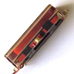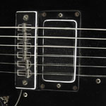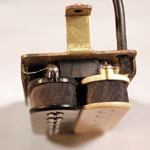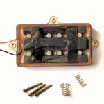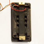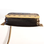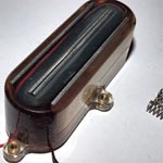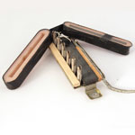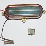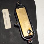 This pickup (Gibson part number 13671) was fitted exclusively to the Gibson Marauder, 1974-1981. It comprised a single coil around an iron former positioned above twin magnets, and potted in resin. Like the Marauder's neck pickup, above, this was initially in a clear case allowing the coil and former to be seen, changing to a black opaque casing in mid-1978. It was similarly mounted with three screws tapping into the pickup casing allowing height and angular adjustment relative to the strings. Dimensions 1.025" x 3.025" x 0.95"