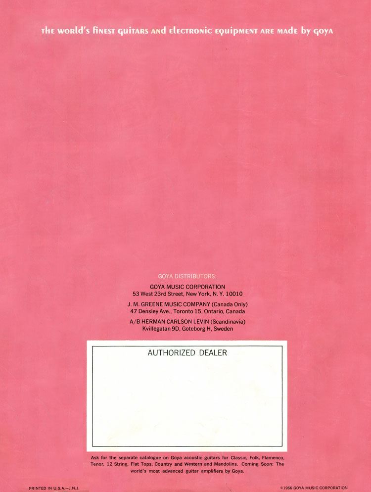 Goya 1966 guitar catalog back cover, dated 1966. Printed in the USA. Distributors listed include the Goya Music Corporation in the US, J.M. Greene in Canada and Levin in Sweden.