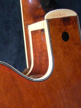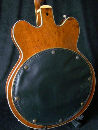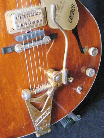 The poor durability of gold-plating is evident here; it has clearly been looked-after, but much of the plating is gone. The original dark brown finish has faded. The only colour listed in catalogues at that time was this, Mahogany Grain, whilst the other two Chet Atkins Gretsches, the Nashville and the Tennessean both had their own colours, amber red and cherry red respectively.
