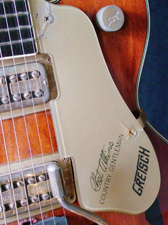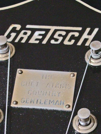 The gold-plated headstock plate has the guitar model engraved onto it: 'The Chet Atkins Country Gentleman'. The Gretsch logo is inlaid in pearl. Note also the truss rod cover, held in place with three screws.