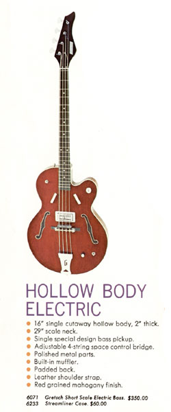 The Gretsch 6071 bass, or Tennessean Bass, was a single pickup hollowbody. The double pickup version was the 6073, and both were shortscale (29 inch).