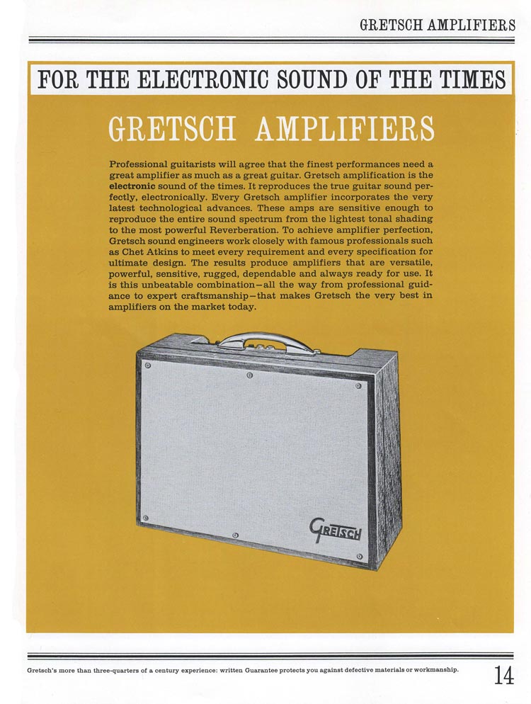 Pages 15-22 show Gretsch's range of guitar amplifiers. 12 individual models are listed, all tube combos, quite a contrast to the mix of combos / separates, tube / solid state amps listed in the 1968 catalog