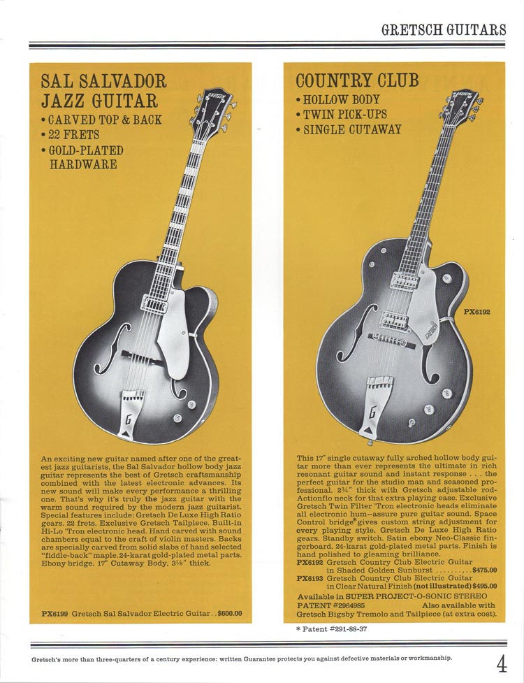 The first (and last) few pages of the 1965 Gretsch brochure are in full color print. By page 5, the brochure changes to two-color print, and although the finest Gretsch guitars appear in the color section, there are plenty of very fine instruments in the rest of the catalog. The majority of Gretsch hollow bodies can be regarded as thinlines - typically having a 2" body depth. The two jazz models on this page are both deeper than the other Gretsch guitars, just 2 3/4" for the Country Club, but a full 3 1/8" for the Sal Salvador.