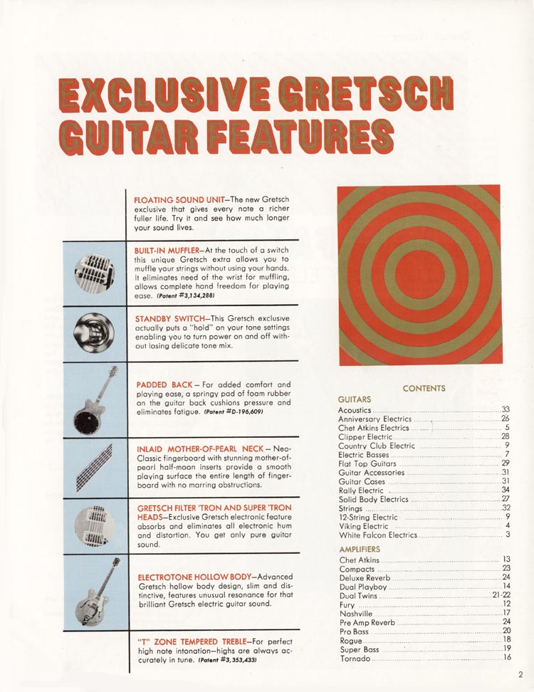 1968 Gretsch guitars and amplifiers catalog, page 2. Aswell as an index to this catalog, this page also highlights a number of "exclusive Gretsch features": floating sound unit, built-in muffler, standby switch, padded back, inlaid mother-of-pearl neck, Gretsch Filter Tron and Super Tron heads, Electrotone hollow body, "T" zone tempered treble.