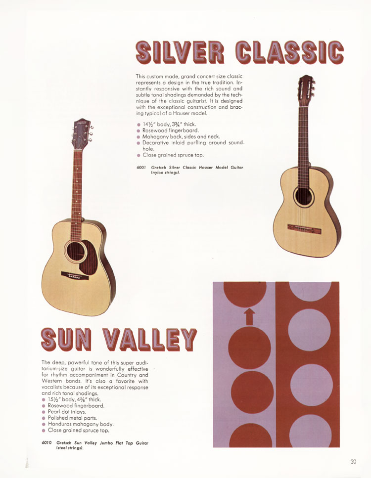 Details of two entry level Gretsch guitars, the Gretsch 6001 Silver Classic and 6010 Sun Valley flat tops. The Silver Classic is described as follows: