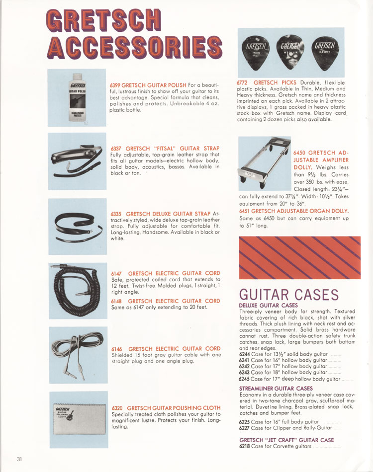 Details of the range of Gretsch accessories: polish, straps, cases, cords, picks etc. The range of cases include: Jet Craft (for the Gretsch Corvette), Streamliner (economy cases for the Gretsch Clipper, Rally and 16" body models), and Deluxe - described as follows:
