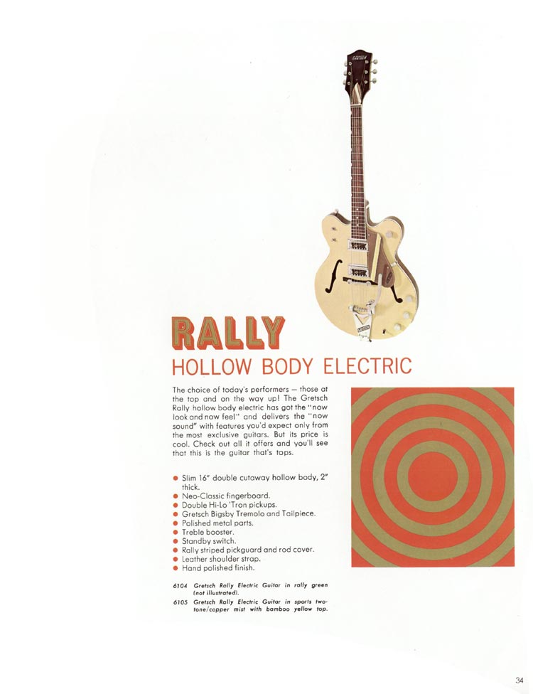 Details of the Gretsch Rally, another model making it's catalog debut on these pages. The Rally was available in two finishes, both listed (April 1968) at $395. The model codes were as follows: 6104, Rally Green; 6105 two-tone Copper Mist with Bamboo Yellow top.