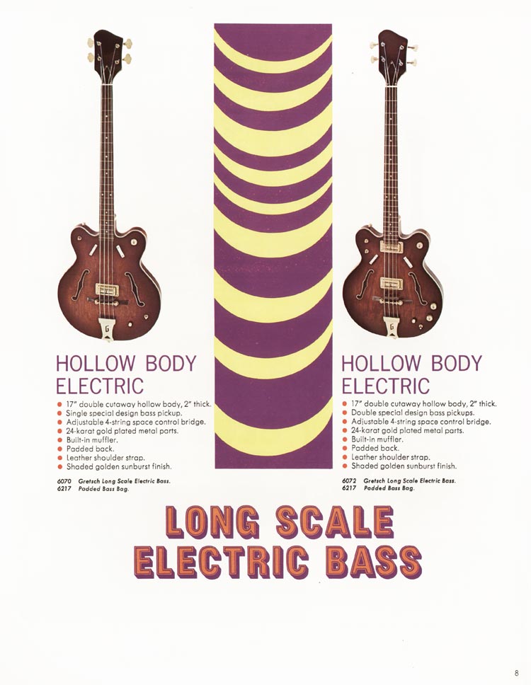Page 8 is the last of two pages detailing Gretsch bass guitars. On this page are details of two long scale double cutaway bass guitars: the single pickup Gretsch 6070, (known as the Gretsch electric bass, or Country Gentleman bass), which had been available since 1962, and the newly launched dual pickup Gretsch 6072, only listed in price lists from 1968, and making it's first catalog appearance on this page. Both models have a large 17" body width and gold-plated hardware. Only Shaded Golden Sunburst is listed as a finish option. The April 1968 US list price for these models was $375 and $425 respectively.