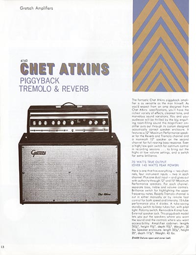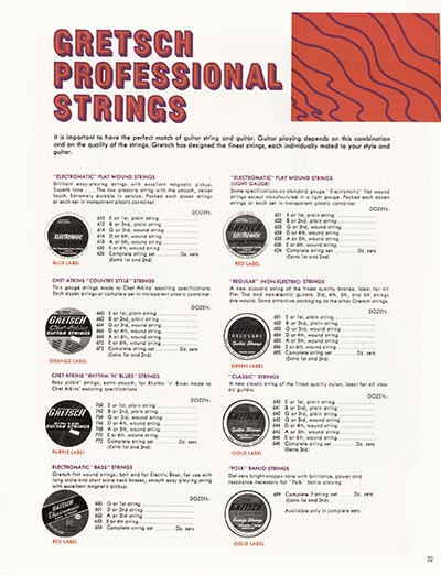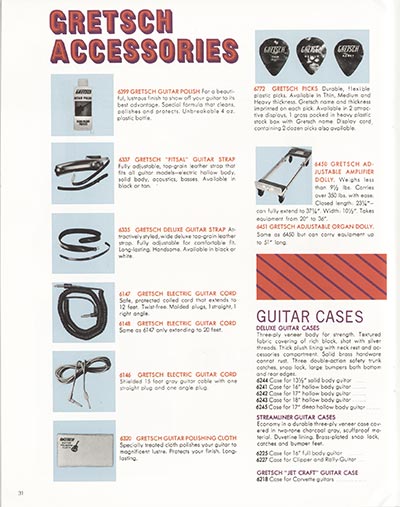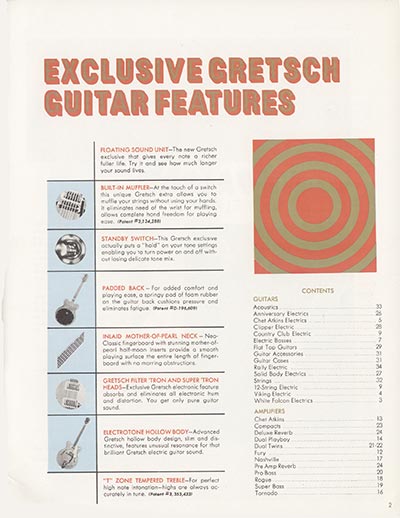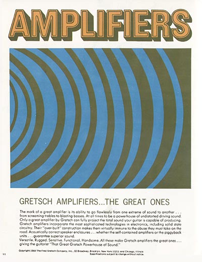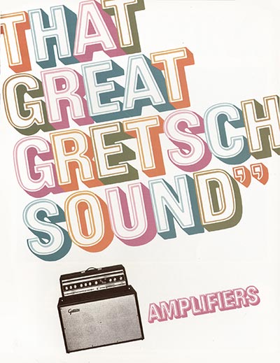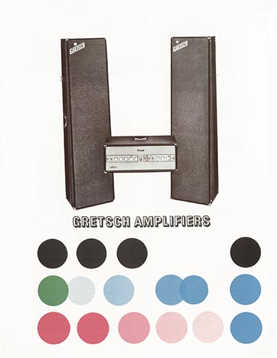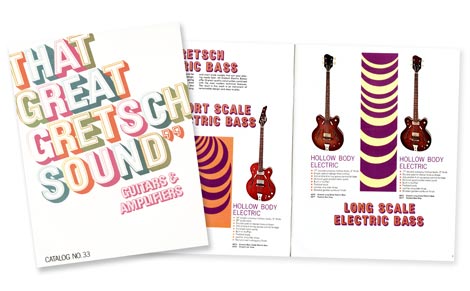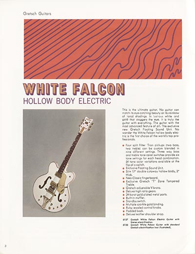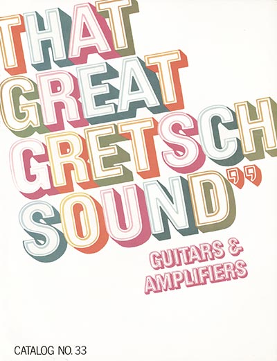 The 1968 Gretsch catalogue "That Great Gretsch Sound" (or catalog no. 33) featured the the entire Gretsch range of electric semi-acoustic guitars and basses, solid bodies, acoustics, and amplifiers over 36 pages, with pride of place going to the highly elaborate White Falcon. Included are 12 electric guitar models, 6 acoustics, 4 basses and 15 amplifiers.