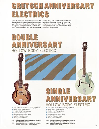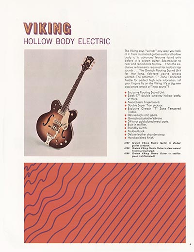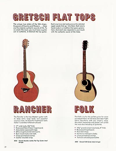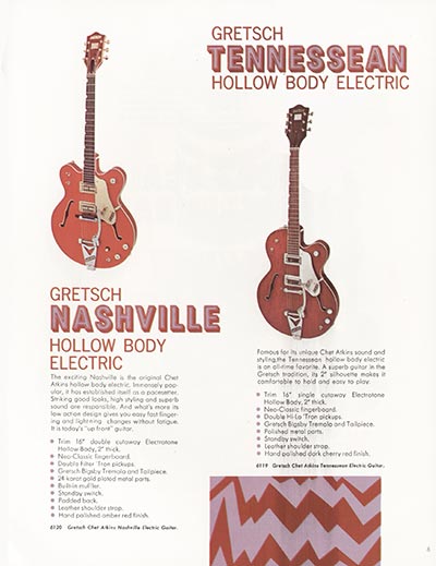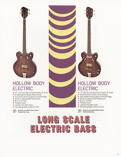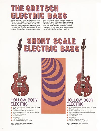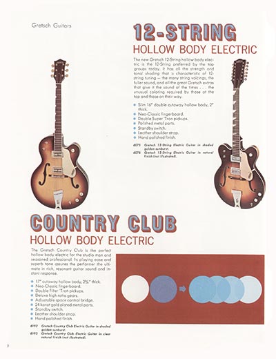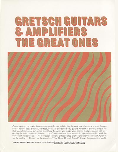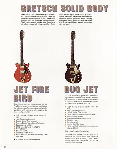 The 1968 Gretsch catalog features the following guitars and basses. Click on the images for full size versions, or click on the model names below to go directly to that page.